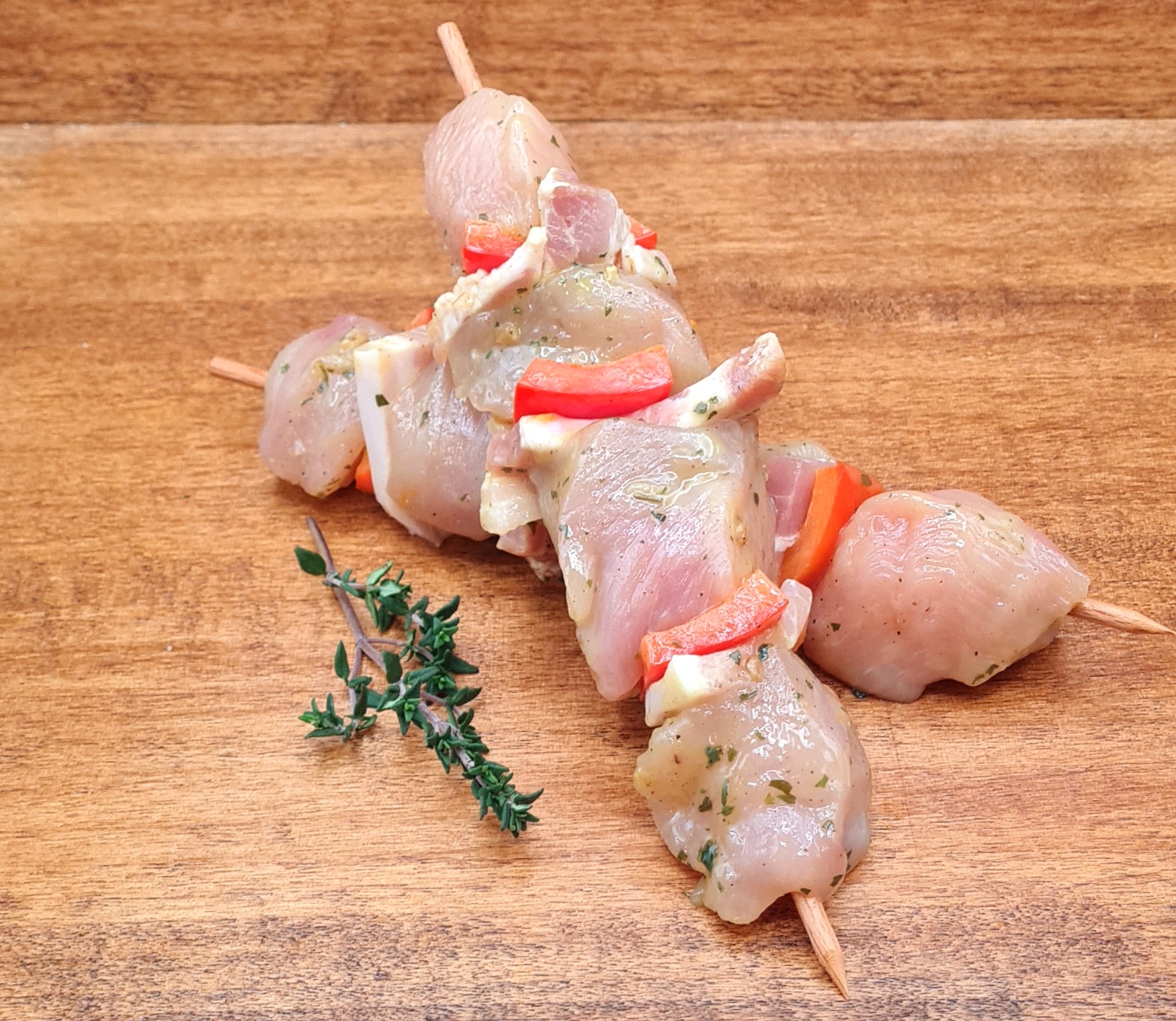 Cube de poulet, poitrine fumée, poivron rouge marinade citron miel