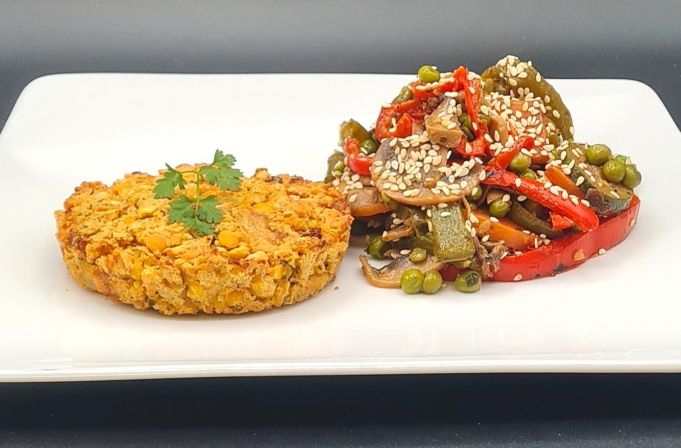 Galette aux pois chiches et épices, poêlée de légumes thaï (plat végétarien)