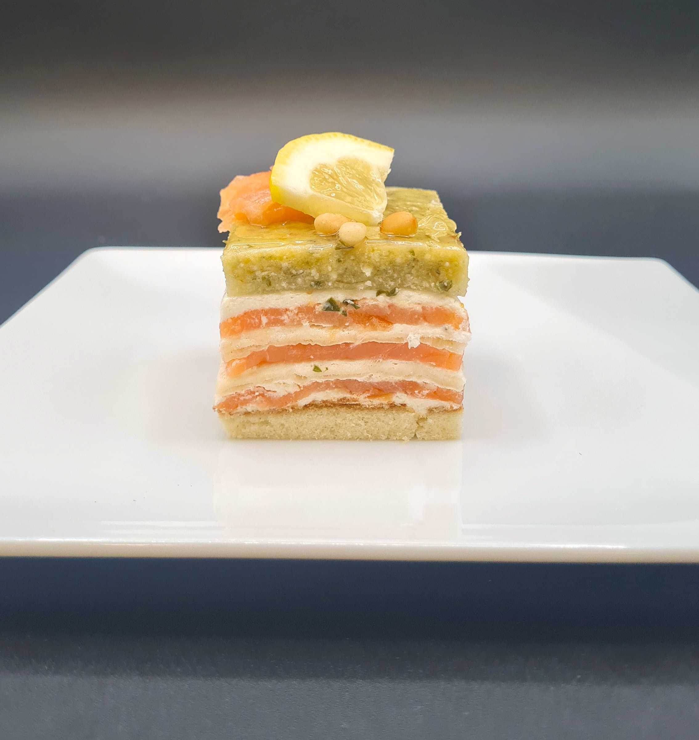 Composition : génoise, wraps, mascarpone, crème, gélatine, saumon fumé, citron, basilic, pignons de pin torréfiés, parmesan, huile.