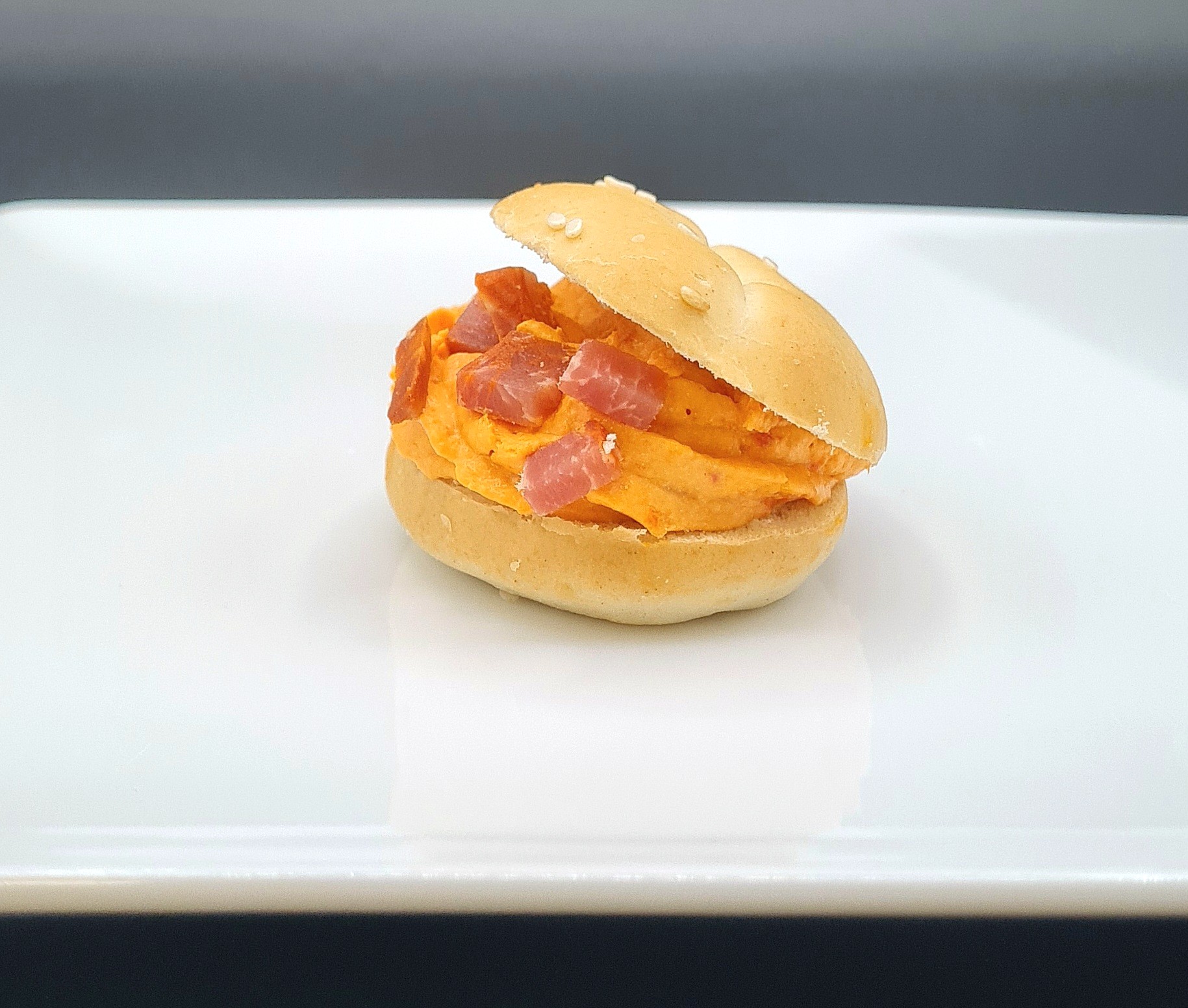 Mini bagel, mascarpone, fromage frais, tapenade poivron rouge, chorizo.
